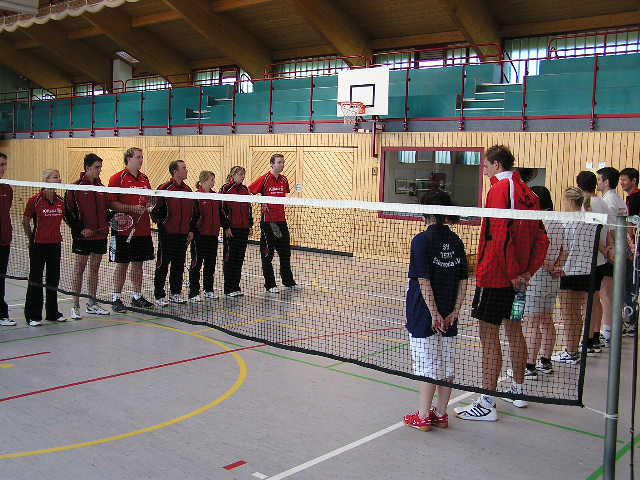 Am nächsten Morgen wurde ein Freundschaftsspiel (Bild bei der Eröffnung) mit insgesamt 14 Begegnungen durchgeführt. Am Ende hatten beide Mannschaften sieben Spiele gewonnen. Für Gernrode punkteten Steffen Sommer/Cornelius Fütterer (2.HD), Christiane Otto/Melanie Raabe (DD), Cornelius Fütterer (3. HE), Christiane Otto (2.DE), Elisabeth Preis/Cornelius Fütterer (2.Mixed), Christiane Otto/Marius Fütterer (3.Mixed) und Melanie Raabe (3.DE). Das letzte Spiel des Tages zwischen Elisabeth Preis/Cornelius Fütterer und den Zeulenrodaern Luise Ackermann/Jens Heidrich bot einen spannenden Abschluß. Cornelius und Elisabeth setzten sich nach spannenden und hochklassigen Ballwechseln mit 30:28 im dritten Satz durch.